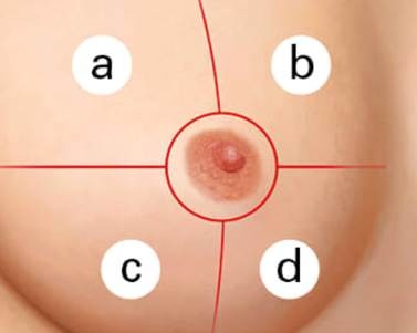 Ausgehend von der Brustwarze wird die Brust in vier Teile – die sogenannten Quadranten – unterteilt. Mehr als die Hälfte der erkrankten Frau haben einen Tumor im oberen äußeren Quadranten (a).